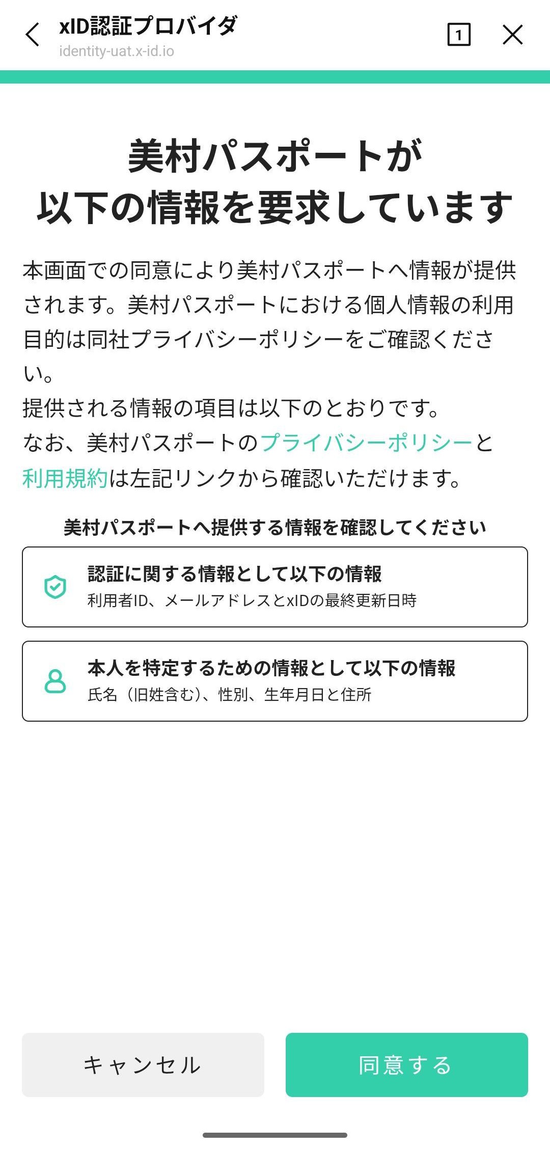 手順2:xIDアプリにて美村パスポートの利用確認が表示されます。[同意する]を選び進めていただくと美村パスポートとの連携が完了し、マイナンバーカード連携済みと表示されます。