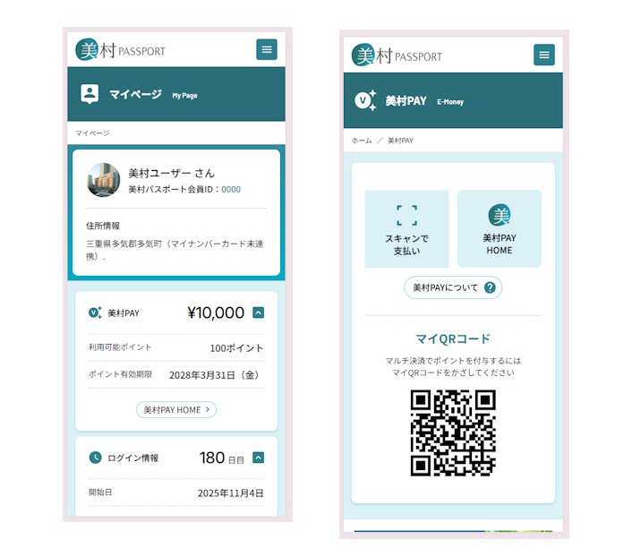 美村PAYのホーム画面より「美村パスポート連携」をおこなうことで、美村パスポートから便利にお使いいただけます。
